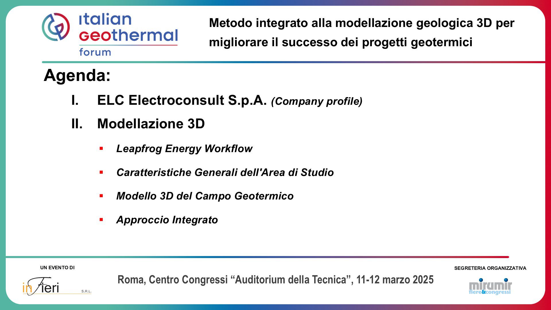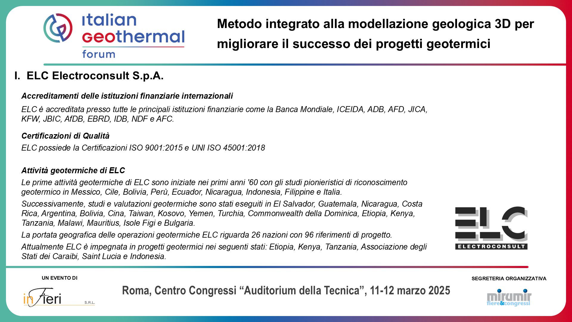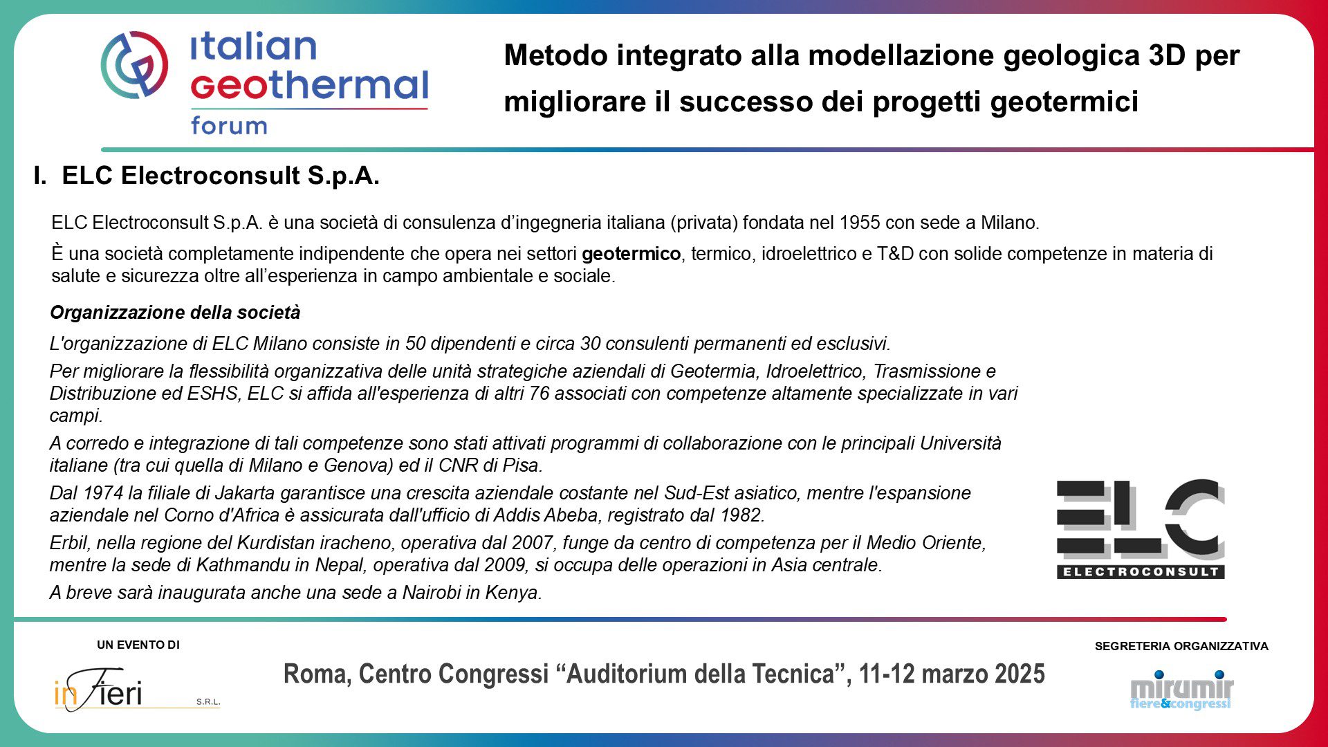 Electroconsult Attends the First Italian Congress on Geothermal Energy in Rome, Italy – ELC participated in the Italian Congress on Geothermal Energy held in Rome on 11-12 March 2025. This landmark event brought together industry experts, researchers, and key stakeholders to discuss the actual situation of geothermal energy in the Italian context as well as its role in the national/global transition to renewable energy.